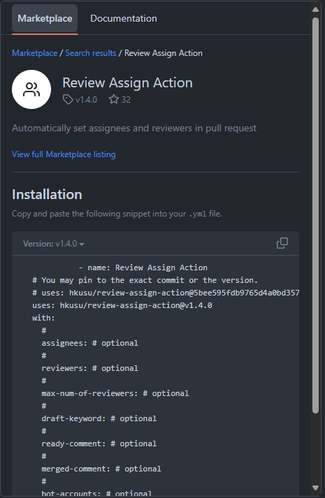 Marketplace에서 Review Assign Action을 검색하고 View full Marketplace listing을 클릭해서 사용방법을 확인한다.