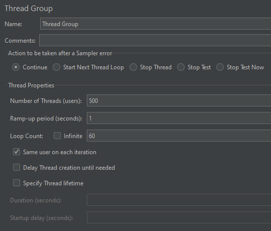위 이미지 설정으로 진행하면 500개의 Theads(users)들을 1초 내로 실행시키고, 60번 요청을 보낸다고 볼 수 있다.